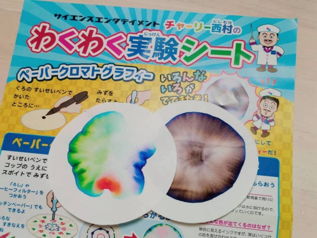 丸い試験紙にペンで丸を書き、水でにじます「ペーパークロマトグラフィー」という科学実験を行いました。