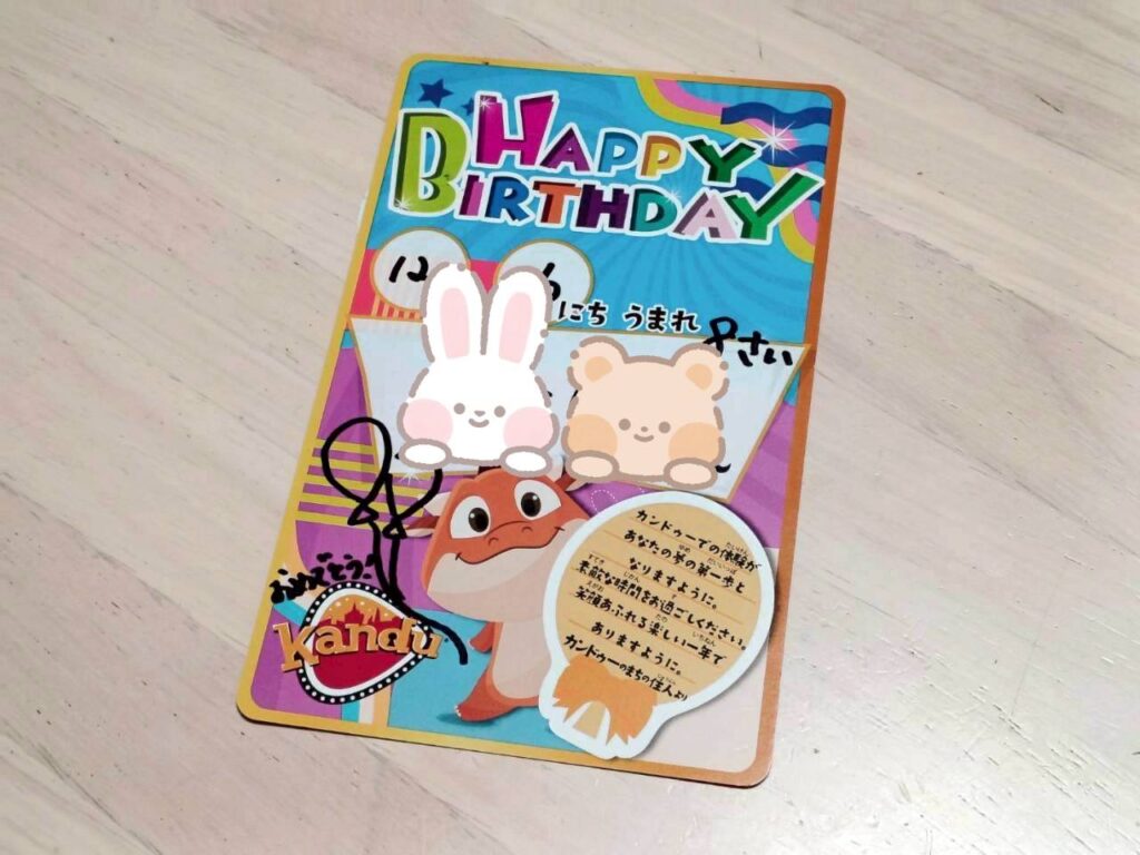 カンドゥーでは誕生日の前後1か月がバースデーサービスの対象になり、一番はじめのお仕事のときにスタッフさんに申告すると、お誕生日カードとシールがもらえます。